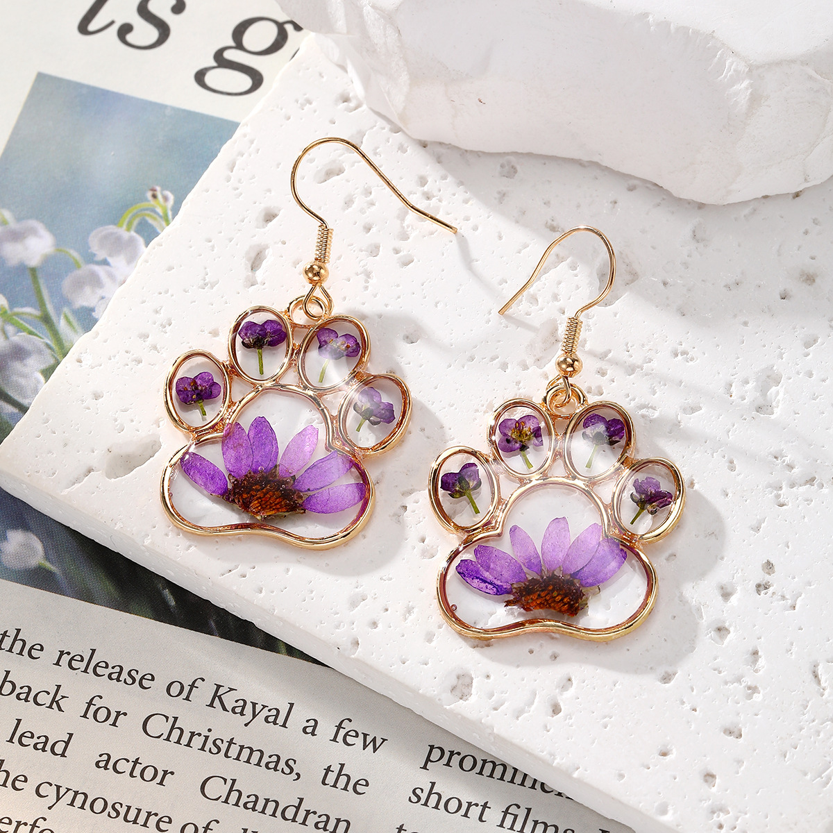 Creative Purple Series Dried Flowers Earrings Jewelry Cute Cat Claw